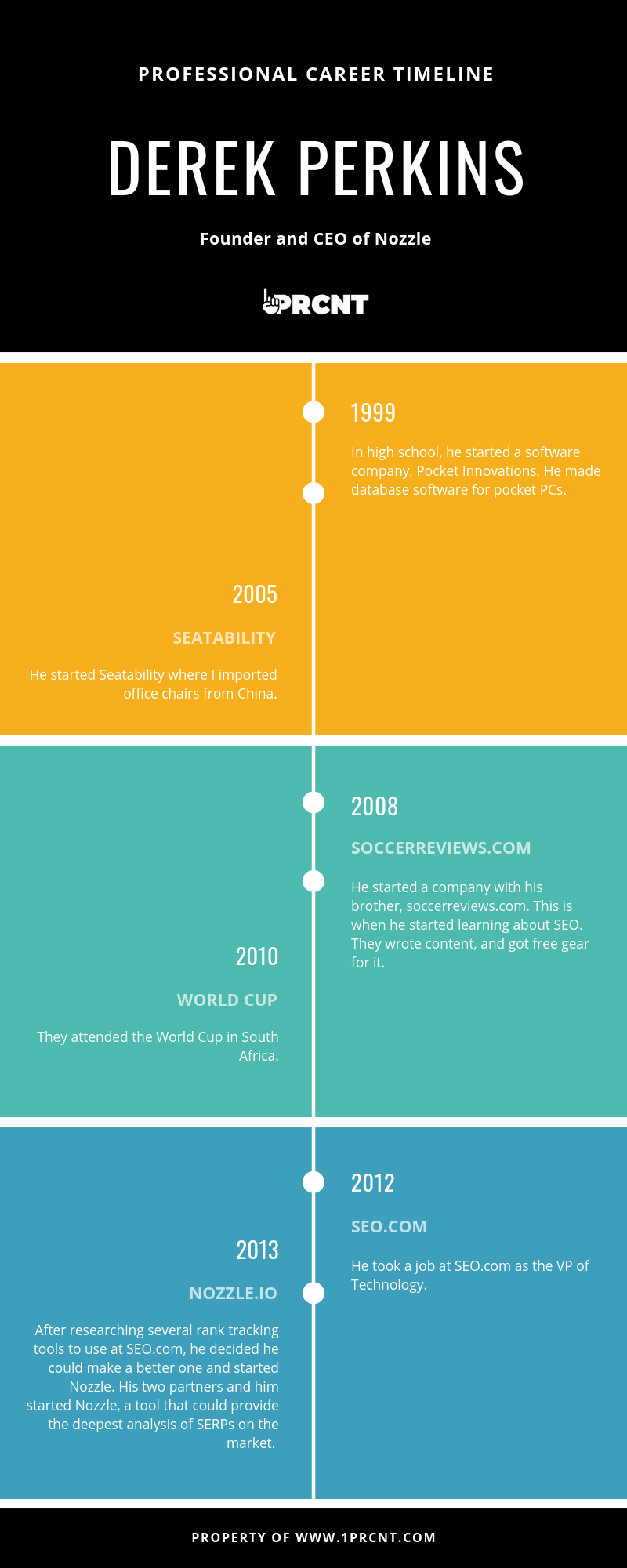 Derek Perkins is an entrepreneur from Lehi, Utah. He is the Founder and CEO of Nozzle, which he started while working at SEO after not finding the perfect SEO software. They have 9 full-time employees doing $1.5 million a year in revenue.
