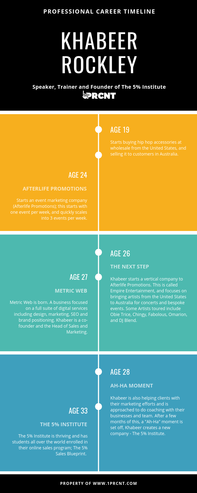 Let’s learn how this entrepreneur got started with a career timeline made by 1PRCNT.com