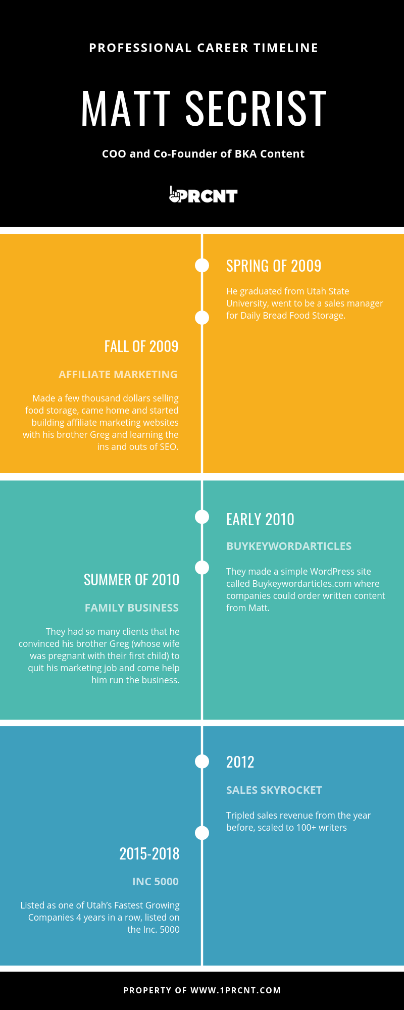 Matt Secrist is an entrepreneur from Syracuse, Utah. He is the COO and Co-Founder of BKA Content, one of the premier content writing services on the web, which he started with his brother Greg. They have been featured on the Inc. 5000 and Utah’s 100 fastest-growing companies lists. BKA Content has 19 office employees, over 300 content writers and have done $2.5 million in revenue last year.
